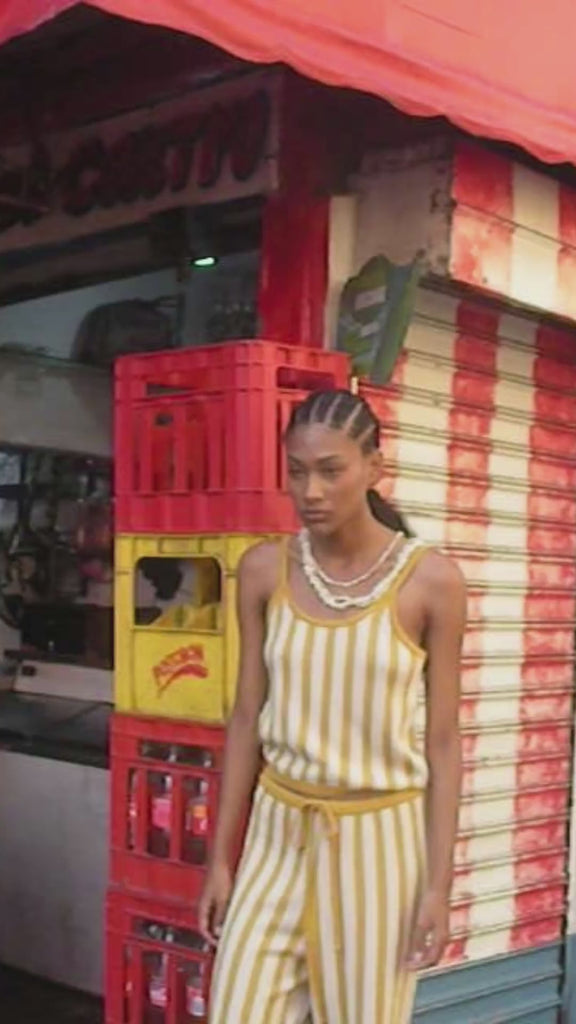 Top de escote redondo y tirantes. Detalle de vivos combinados a contraste. Pantalón recto, con cintura ajustable con cordones. Acabado en rib.