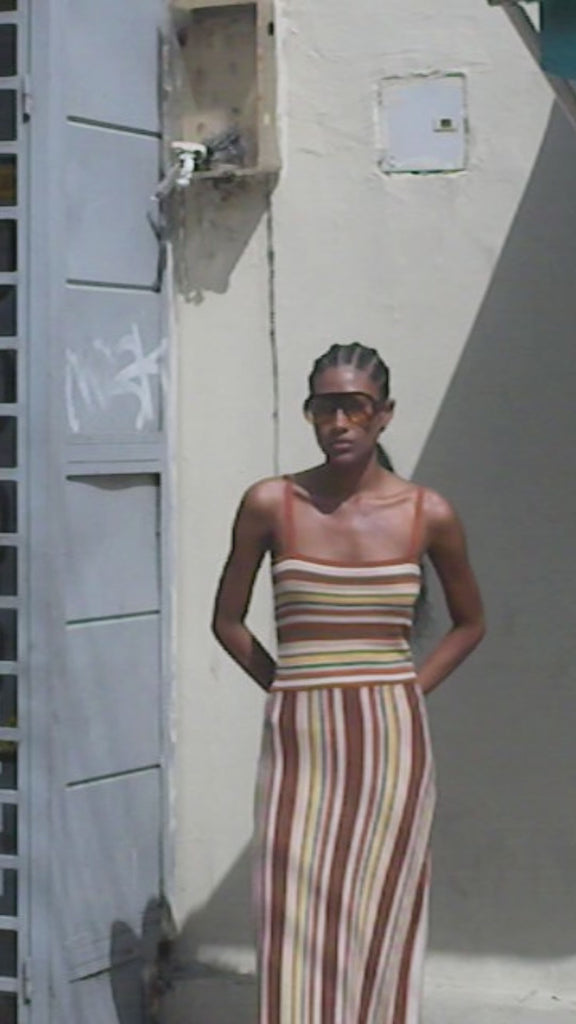 Vestido de escote recto y tirantes, corte en A. Acabado en rib.